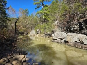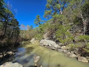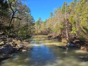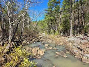 Morris Creek, which runs seasonally, adds charm to the land. The diverse terrain ranges from flat areas to sloping hills, offering stunning mountain and valley views. Covered with timber, including shortleaf pine, oak, and hickory, this property is a haven for wildlife such as deer, turkey, and small game.