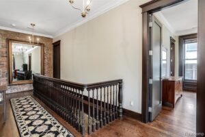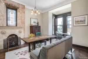 Additional living spaces include an inviting dining room, a formal living room adorned with original woodwork, and multiple flexible areas on the garden level. The finished garden floor is perfect for hosting parties or casual get-togethers, featuring a stylish bar area, an office for remote work, a home gym for fitness, and ample storage space. This multi-functional level enhances the home’s livability and entertainment potential.