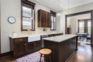 The kitchen is a showstopper, designed to evoke the craftsmanship of the 19th century while offering all the conveniences of today. Custom-crafted cabinetry with marble countertops and tall paneled doors with custom brass latches recreate the historic look. High-end stainless steel appliances and a sleek hood fan seamlessly integrate into the space, making it a joy for cooking and entertaining.