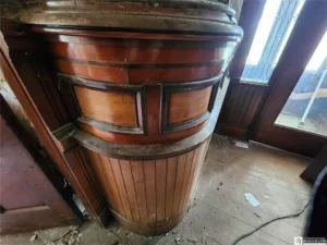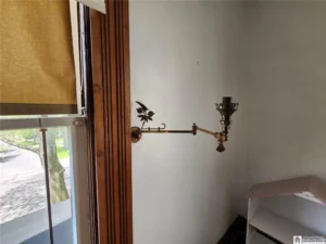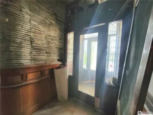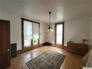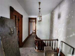 - Historic Fireplaces: Two fireplaces remain, one featuring remnants of a green marble mantel, adding to the home’s period charm.